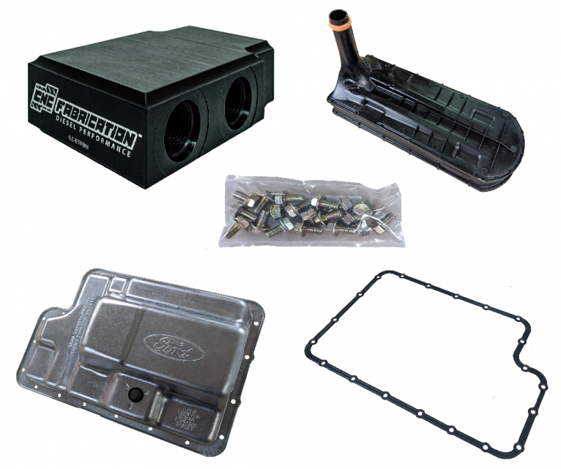 This kit is for those who want to install the Ford JOB2 5R110W transmission pan and filter found in the 2008.5-2010 6.4L Powerstroke, and is perfect timing if you are wanting to do a full service on your transmission anyway.