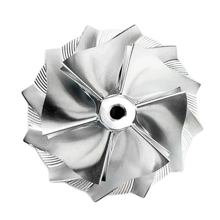 Our KC drop in 6x6 style billet compressor wheels with extended tips are a great upgrade for your 94.5-03 7.3L Ford Powerstroke that is looking for a little quicker spool, a little more air flow, and lower egts. This wheel is not noisy like some of the other wheels on the market, but you can literally hear more air flow with this installed.
